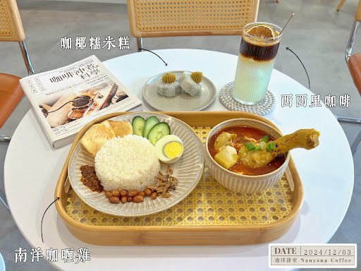 Read more看到有人發文,覺得這裡看起來好漂亮,而且我自己非常喜歡南洋風味的料理,也很喜歡喝咖啡,居然有特別將兩者搭在一起的美麗小店,決定在放假這天來一探究竟🥹! 🐔南洋咖喱雞:櫃檯小姐說老闆是馬來西亞人,所以南洋咖喱會非常道地🥹,燉煮雞肉的湯頭有著豐富的香氣,蘿蔔和馬鈴薯等食材的鮮甜都被熬煮在一起,雞肉非常軟嫩入味,微辣,嘴唇會麻一段時間,是一道非常值得細細品嚐的餐點!椰香飯香軟而不粘牙,第一次吃到煮得如此好吃的米飯,即使不蘸著湯汁入口也十分有個性。一旁的佐料我其實不太認識,但也許是沙茶嗎?我覺得非常好吃,是從來沒有吃過的美味,甜甜鹹鹹,很下飯。平常我是很討厭吃花生和小魚干的人🙃,但南洋甜室的花生和小魚干非常好吃🥹! 咖椰糯米糕:店裡還有其他比較常規的精美甜點可以享用,但我覺得該試試看南洋風味的娘惹糕,沒想到居然非常令人驚艷,主體是糯米,鹹甜軟糯的口感,搭配頂端的咖椰,讓我覺得它值得更高的身價🙃,但居然這麼平易近人,cp值非常高! 西西里咖啡:是有氣泡水的版本,呈現上來的模樣非常好看,甜度剛好,不會太苦也不會太甜,我好喜歡🥹💚! 店裡還有植物的陽光房,本來想要帶拍立得來拍照,最後擔心路途遙遠所以沒有帶,我真是後悔死了🙃,這個空間超級relaxing...