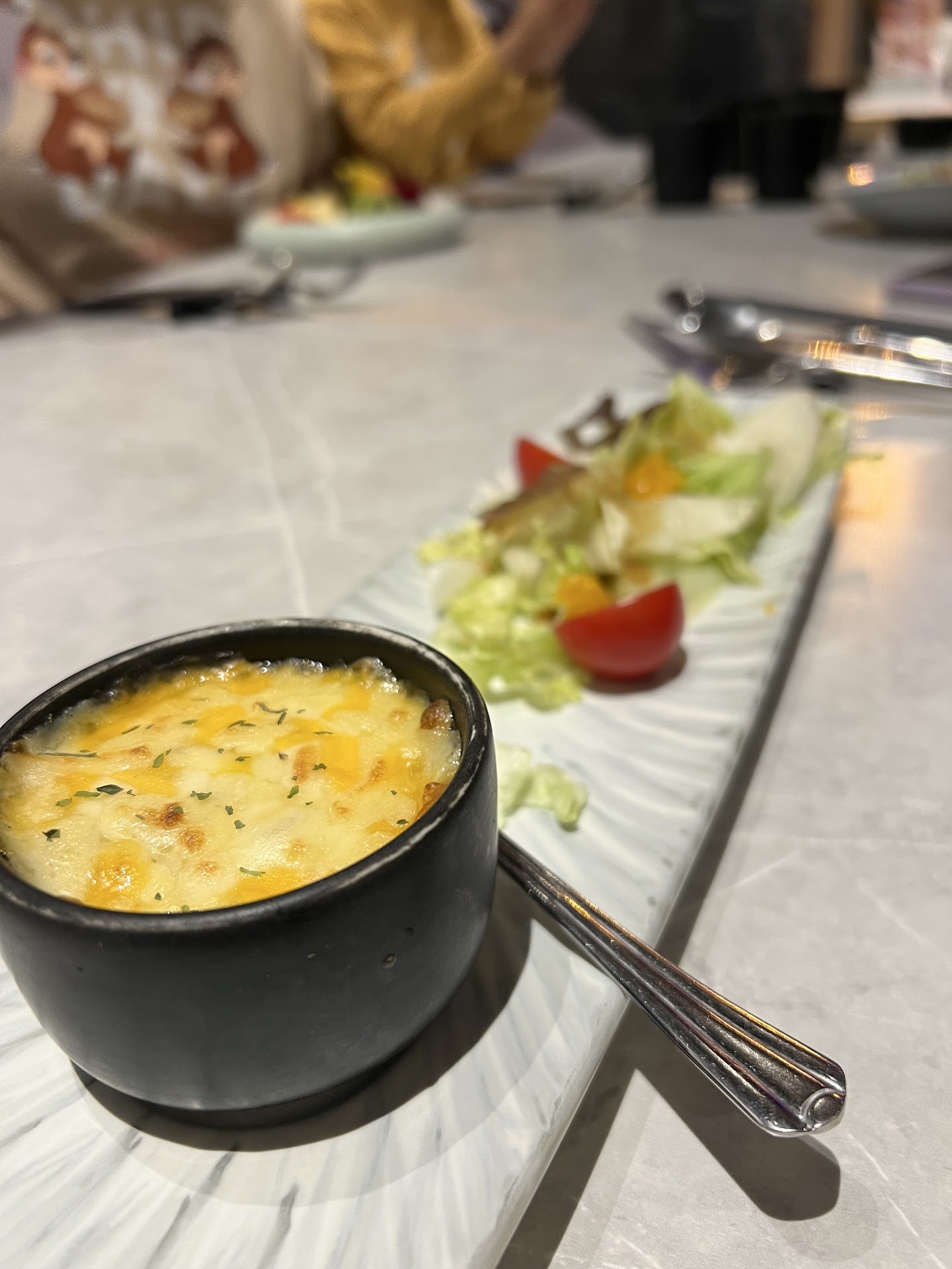 起司牛肉炊飯 好吃,飯本身就已經好吃了,再加上起司,太罪惡了!只可惜它是甜點前的最後一個餐點,吃好飽啊!