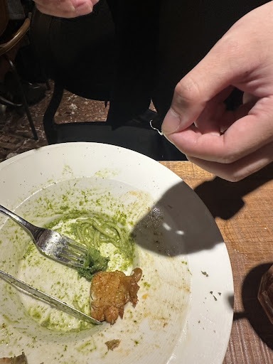 當下太驚慌,看這麼多新聞,第一次親自「吃到鋼絲」,整個約會都沒心情了,而且喉嚨一直覺得怪怪的,就座在椅子上休息,結果遲遲未見店家相關幹部出面,甚至詢問關心我喉嚨狀況,由於服務生說「是我們廚房的問題」,我不忍了,再叫一次服務生來問:這是第一次客人吃到鋼絲嗎?店長知道嗎?為什麼你會說是廚房人員的疏失?是什麼意思?那內場製作義大利麵怎麼會做出鋼絲?甚至我還教學服務員⋯客人吃到異物怎麼會沒有關心客人?只是一直強調「要不要再點餐我們招待」,感受很差。