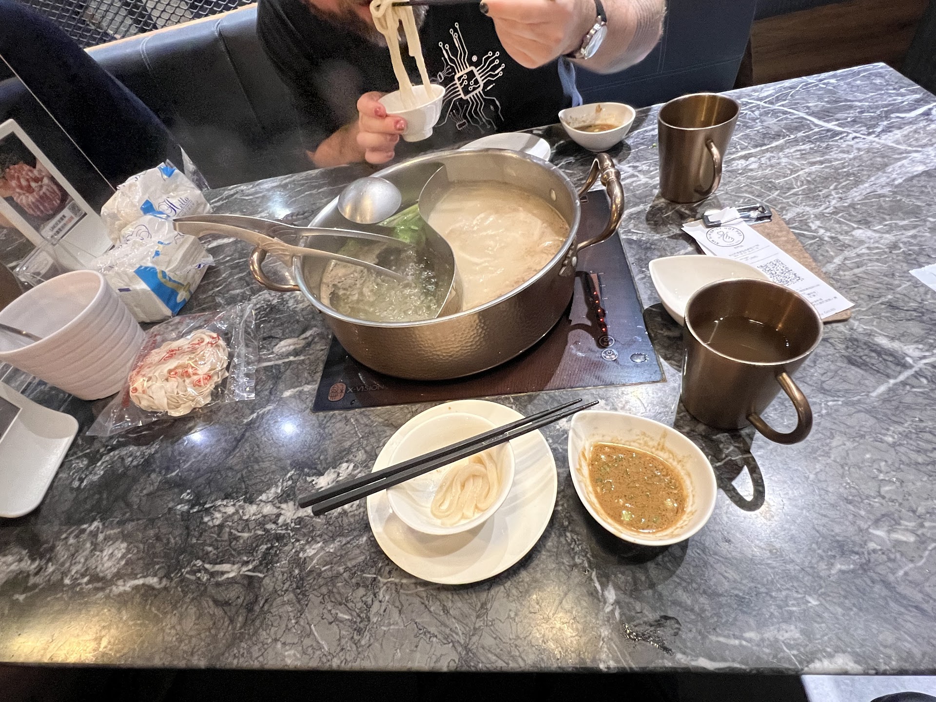 We got the spicy and the plain broths. The spicy one tasted old and like intestines, and it had way too much star anis. The plain broth also tasted a bit off. We ordered six types of meats including three types of waygu, and out of the six only one tasted ok, the rest were dry and tasted off - unfortunately it was unclear to us which one was the ok one, so we didn't bother to order more. Even the ice-cream wasn't as advertised - it hardly had any filling and might as well have been that cheap rainbow ice-cream you get a children's birthday parties.