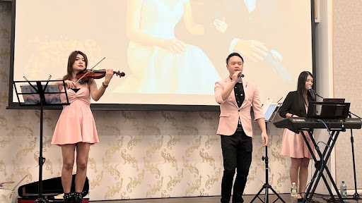 當天婚禮樂團是三人組,有主持(主唱)、電子琴彈唱、小提琴。小提琴桌邊演奏贏得賓客熱烈的讚賞,主持人和現場來賓玩猜歌名遊戲,賓客都非常投入,整場非常歡樂,賓主盡歡。
