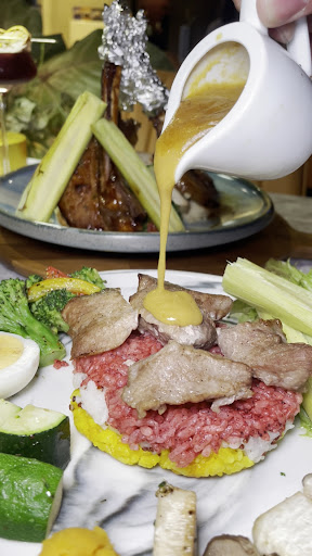 🌟 炙燒焦香雪紋豚彩虹飯 $350 蔬菜搭配肉品營養均衡彩虹飯,配色視覺效果看了食指大動!嚴選黃金六兩肉之稱僧帽豬肉搭配芥末椒鹽烘烤,帶有微微炙燒香氣肉質紮實Q彈多汁,淋上一旁所附的成真特製咖哩醬,擁有迷人咖哩香,彩虹飯天然染色分別是紅趜、藜麥、薑黃,米飯,搭配一旁蔬菜,整體美味豐富清爽!