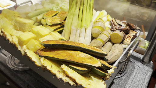 集合了白花椰、杏鮑菇、娃娃菜、茄子、地瓜、櫛瓜、茭白筍、玉米筍、白蘿蔔、鳳梨等十種食材的《鮮切爐烤鮮蔬台》,每種食材或蒸或燙或煮或燒烤,保有食材原型,保留蔬果鮮甜,口味和口感皆屬上乘。