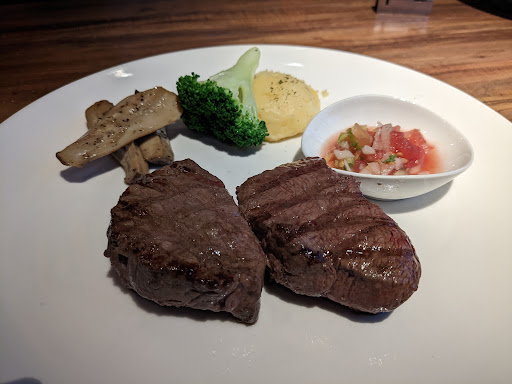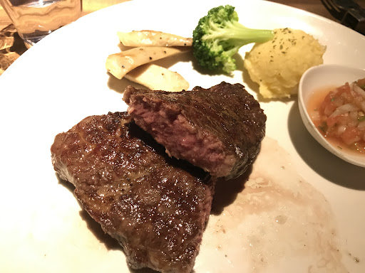 2024/09/29 2人進食共點了 點了板腱 牛小排 菲力 板腱一樣非常多汁,風味複雜有層次,真的是最愛。 牛小排吃起來比較脆口的,也有些許的筋膜,咬起來是油汁會逐漸咬出來,油脂甜感還不錯,但就是稍嫌單調,比較無趣。 菲力五分熟完美,真的超級軟嫩,雖然不會有肉汁,不過咬起來很清爽的感覺,可能是紐西蘭牛的關係(偏多草飼?),沒那麼鮮甜爽感,而是像黑鮪魚瘦肉那種比較偏向金屬、血液的味道,咬起來也是非常有趣。 整體來說最喜歡板腱,再來是菲力想要吃得優雅、清爽就選它,牛小排下次應該都不會再點,過於單調膩口,而且價格也偏貴。