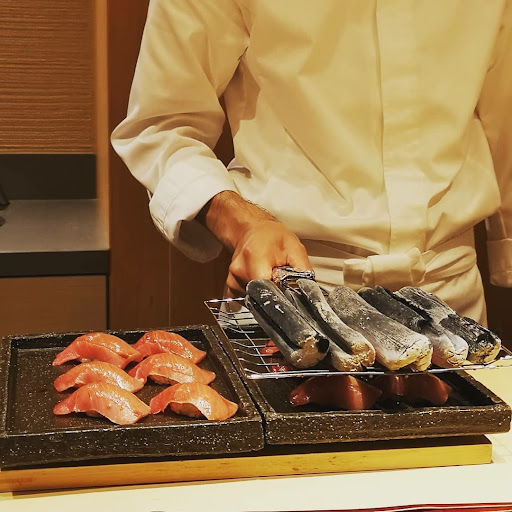 Upmarket sushi restaurant presenting innovative cuisine amid streamlined surroundings.