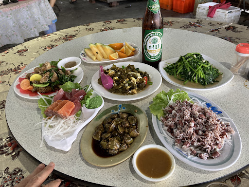 10/30(三)趕在颱風前離開小琉球,因害怕風雨便改變計畫在華僑市場吃~臨時找的包滿海鮮,很害怕會踩雷或被當盤子敲,還好擔心的都沒發生~ 提早打了電話確認位置(共16-17位),告知當場點菜即可,分兩桌、沒有固定菜單,會詢問預算一桌多少(我們吃$5000*2),再依當日有的漁獲配菜,需要調整食材/修改烹煮方式的都可以溝通,雖然列菜單等得稍微久了點,但有先上小菜「醃漬蜆仔」,超級好吃!!!跟中部吃到偏鹹的很不一樣,又決定買$500外帶🤣🤣🤣 菜單只記得大概…炸蚵捲、川燙中卷、櫻花蝦炒飯(原一桌上三份,後又加點一桌兩份,超爆好吃!一生推!)、薑絲蛤蜊𩼣魚湯、生魚片雙拼(鮭魚/鮪魚)、胡椒鳳螺(也好吃嫩嫩的,肉不過老)、川燙蝦、炸白帶魚、蛋炒螃蟹、糖醋魚(忘了是啥魚)、塔香海瓜子、冷筍魚卵拼盤、招待果盤/炒青菜,整體口味都不錯,不會太油,但炸的選項比較多溝通後換掉,推薦給較多人、不方便穿梭在華僑市場小攤販的人~ 重點都很新鮮~ (太美味了、一上桌掃光光...