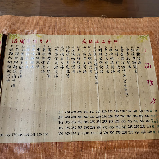多達二十幾種燉湯 🥘 接近二十種是認真的中藥燉湯 中藥燉湯也還可以搭配不同主菜去 若是最基本的就是蔬食,但湯頭會偏澀 建議可以點一些肉類 用油脂去中和會比較好入口 (豬肉片+10/排骨或腰花+35/雞腿+55/鱸魚+80) 若是很怕中藥味也有大眾款的煲湯六種
