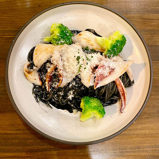 🥘鮮小管·墨魚醬·細扁麵(380 ) 我跟礁溪達人都點這道 有點驚訝的古早魂編爸竟然想吃墨魚醬 這道我覺得偏呈現黑醬本身的風味 所以感覺只有加入些許調味 大部分就是簡單的鹹香與淡淡的墨魚醬鮮味 因為麵量滿多的吃到後來會些許單調 不知道可不可以客製化加點小辣? 另外的賣點單然就是整尾小管 使用簡單烘烤保留原味及鮮嫩