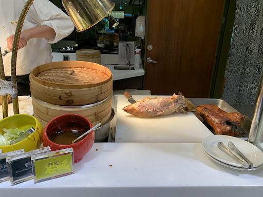爸比到餐廳的時候,照慣例先繞一圈,然後拍一下菜色,走到烤鴨區觀望的時候,內場師傅很親切招呼我,爸比也就順手拿了份烤鴨,師傅切了份烤鴨給我,然後貼心的提醒我取餐要記得戴手套!哎呀!都忘了我只是來拍照的😂!不小心就取餐了!真是不好意思!