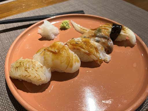 醋飯較為軟糯,酸味不明顯;塗在握壽司上的醬油偏甜,不太習慣;芥末是好吃的,但下手過重,撇除上述小細節,魚料...