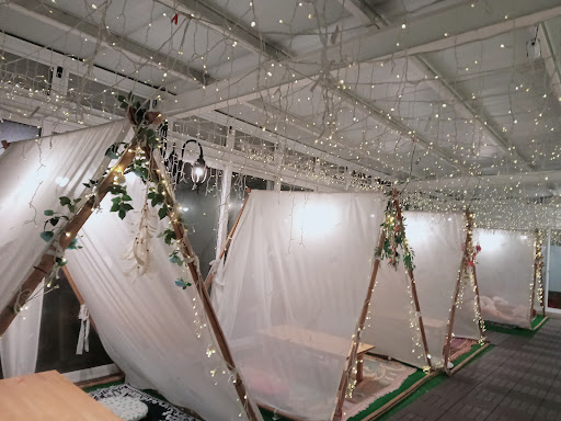 1.童軍風格的布置 用帳篷將每個座位隔開,有戶外、室內區。 Scout-style arrangement Separate each seat with a tent, with outdoor and indoor areas
