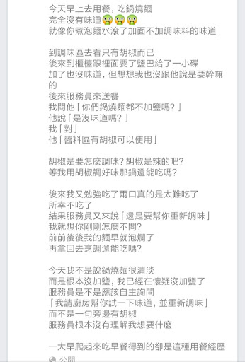今天我不是說鍋燒麵很清淡 而是根本沒加鹽,我已經在懷疑沒加鹽了 服務員是不是應該自主詢問 「我請廚房幫你試一下味道,並重新調味」 而不是一句旁邊有胡椒 服務員根本沒有理解我想要什麼