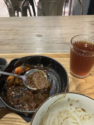 口味的部分都比較主觀一點 但很客觀的就是牛肉真的很少 薄薄的比湯匙還要小片總共只有四片 不說的話會以為馬鈴薯才是主角 另外我到的時候(19:50)烤餅沒有了 有點小可惜 不然可能會加分的 白飯也小小一碗而已 寧願價格直接加100元 至少能展現出份量的大方 蔬菜湯的部分是一塊炸洋蔥圈加上胡蘿蔔番茄 整體算清爽開胃 蠻不錯的