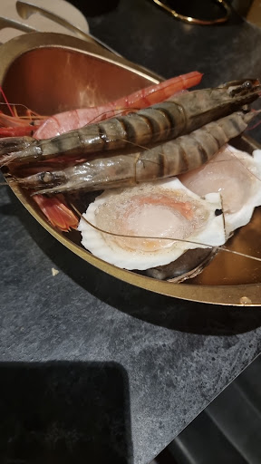 這次差不多晚上九點過來 (不算太晚),但餐廳人很少,可能只有我跟另外一桌。 但是不知道為什麼海鮮區,只有少數扇貝,還有生蠔,剩下一兩隻天使蝦還有小小的草蝦也沒有鮑魚。其他火鍋料蔬菜區,也零零散散的.