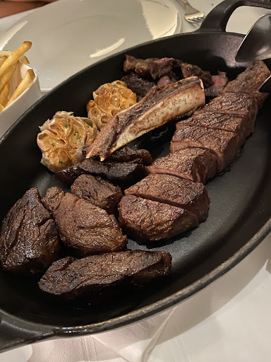 We ordered the 600g 30-day dry aged Australian wagyu bone-in ribeye, medium rare. When served, only about 2/3rds of the meat was from the proper ribeye cut. The remaining third was various fat and extra trimmings overcooked (well done) as individual strips and then arranged around the actual smaller ribeye. The ribeye tasted great, perfect medium rare, but the trimmings were just chewy jerky.