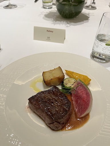 First, the good; The wagyu filet mignon was outstanding and I'd highly recommend ordering this dish with a nice glass of red. We also ordered a seafood dish that a bit of everything and the scallops, lobster and shrimp were great! There were a few servers helping us throughout the night, but the sommelier was far and away the best server we had. Very personable, great English and good wine recommendations. And because we were there celebrating my wife's bday, they gave us a free bday dessert complete with candle and bday song.