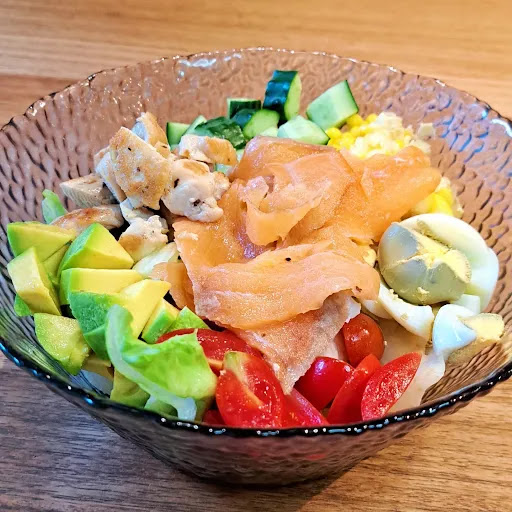 好適主廚沙拉加燻鮭魚:沙拉份量驚人,最底下是清脆鮮嫩的生菜,上面鋪滿各種配料:酪梨、蕃茄、小黃瓜、煎雞胸肉、水煮蛋,我們還額外加點燻鮭魚,清爽營養又有飽足感。