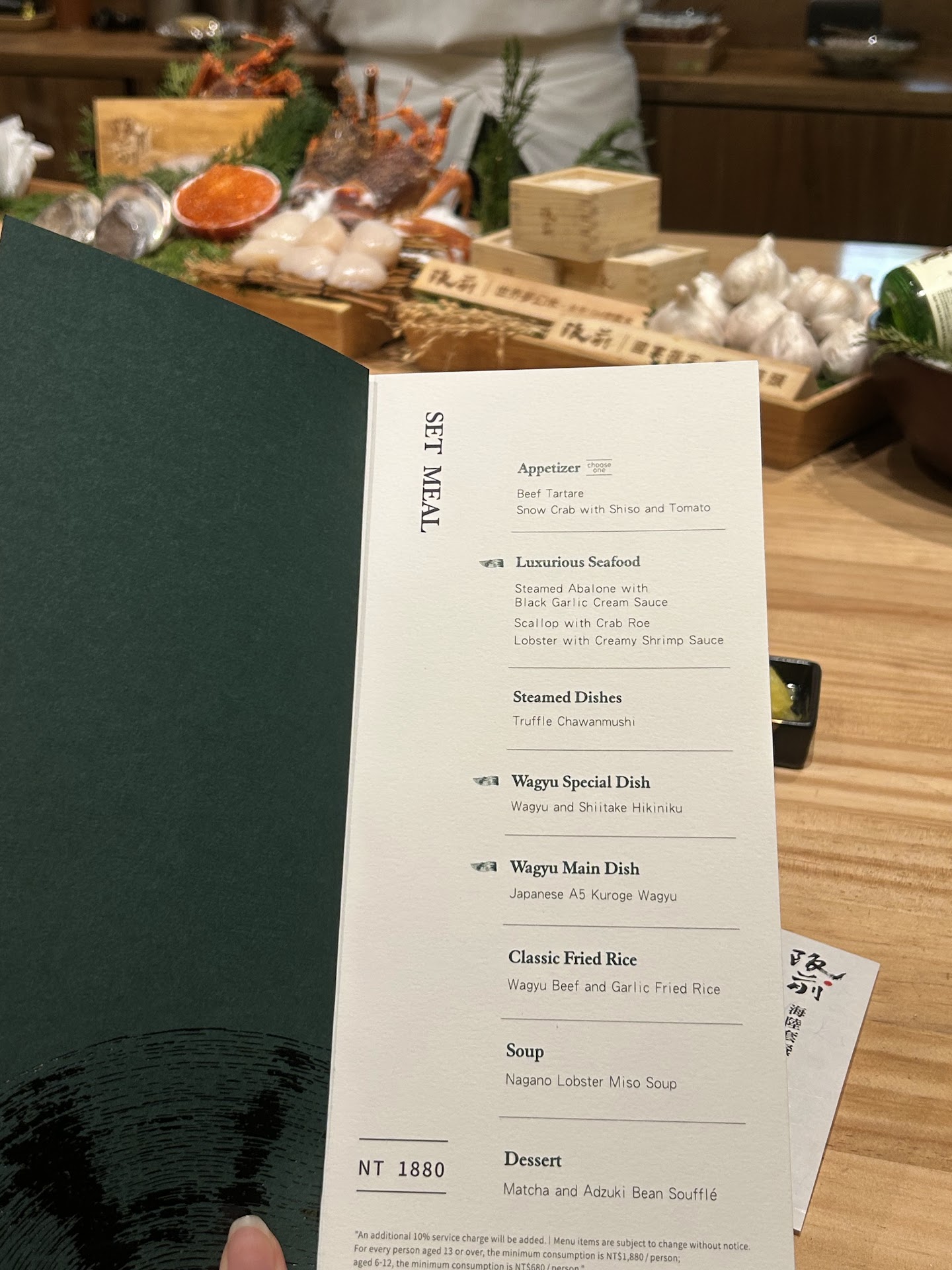The main issue was that we felt rushed during the meal. The dishes were prepped in order and in quick succession - you basically have to eat rather quickly, since each course is cooked together for the group of 10 seated around the same teppanyaki. Often if you're not done with your current course, the next course will be presented anyway and just left to the side, which means you don't really have the time to slowly savour the dishes - which to me defeats the whole point of omakase dining, to enjoy the dining experience. Not sure if it's the price point or because this is the standard style of service in Taipei, as this is only our 2nd omakase dining in Taipei.