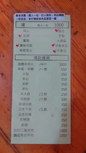 Read moreWe came her with the expectation that we will enjoy some quality lamb but ended up disappointed. First of all, we came here on a Saturday night at around 7pm and they ran out of sliced fresh lamb. It wasn't even full when we arrived. We ordered their standard hotpot that supposed include vegetables of your choice and half a catty of lamb meat. Unfortunately, the lamb meat were actually mostly fat without much lean meat. The broth was nothing remarkable. We actually enjoyed their stir fried vegetables the most. Given it's price tag of of more than 500TWD pe person, you'd expect better...