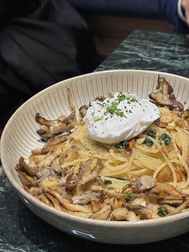 Roasted bell pepper with two eggs pasta - cooked in parsley and garlic and balsamic vinegar really showcases how simple fresh ingredients cooked with diverse flavors and textures to keep us interested until the last bite. Pasta is on the firm side by default and can be requested for a softer texture.