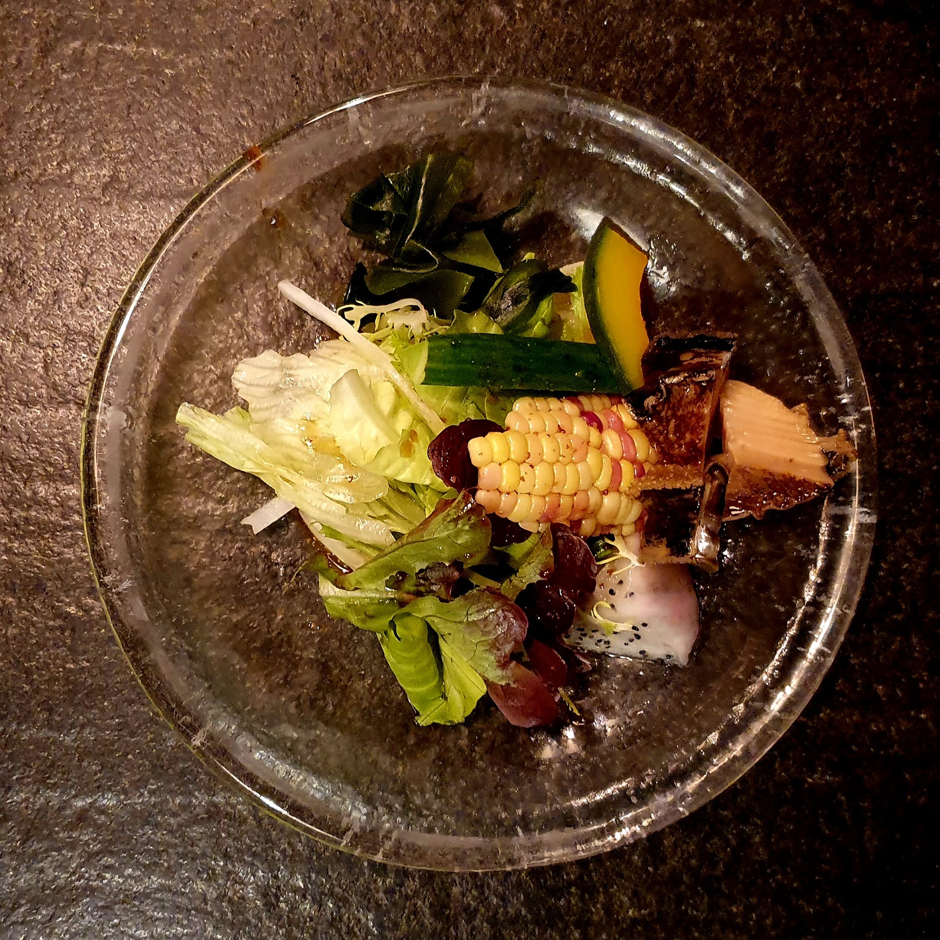 炙燒鮪魚還滿多片的, 鮪魚裡面還是生的但是表面有炙燒過, 所以是外熟內生. 雖然還不錯, 但是剛剛已經吃了不少生魚片, 所以就不覺得那麼美味. 生菜部分是用胡麻醬調味.