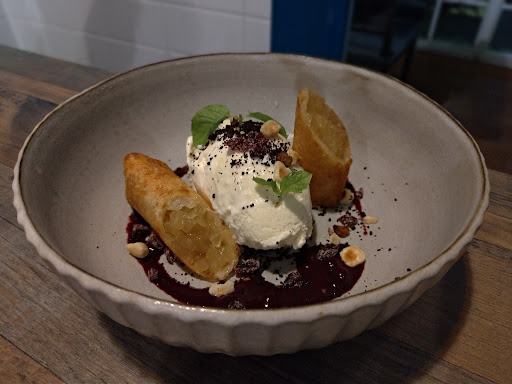 Nice deco with blue theme. Clean and neat. Great plating. All the food are tasty and above average but missing one signature dish to stand out. Duck breast is tender but the plate was not hot and the taro sauce is interesting but not really adding flavors to the duck. Would recommend some sweet and sour sauce to go with the duck such as a variation of Hakka orange marmalade. The fig salad is tasty but it tastes like a basic salad with balsamic sauce without special salad leaves to highlight. Prosciutto in the salad is too light, and cannot be spotted by the tounge. Figs were nice additions to the salad but again the the salad is missing a soul. Opeitsei tastes good and the presentation is very amazing. However, the flavor is not too different from normal Taiwanese food stand except it's without soya paste. Garlic potatoes chips taste like normal chips which you can by on the street chips chain but the sauce was nice with the spring onions additions. Merlot wine from USA was surprisingly good and smooth. The spring chicken of the risotto is a bit dry and tastes like normal grill chicken topped with some white pepper power. Risotto with chestnuts was a great idea and the risotto rice was el dente. Probably can consider using truffles in the risotto to give it a hit of flavor. Finally, dessert apple pie roll was a great surprise. Apple meat was so fresh and perfectly seasoned with cinnamon powder. The homemade vanilla ice cream is so refreshing and definitely deserves a big thumbs up. Overall, it's a nice restaurant to visit, and you will not be disappointed. But it does have a great potential and has some works to do if it is aiming for...