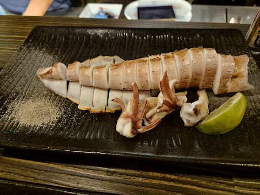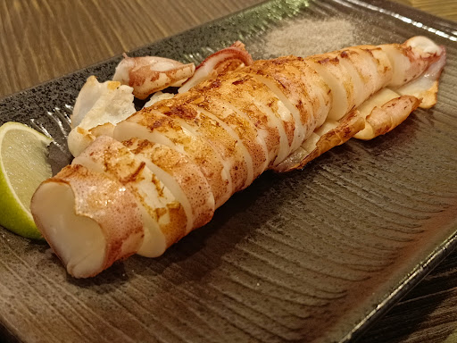 “豬肉櫛瓜卷”是櫛瓜切條狀以豬肉片卷裹後燒烤,燒烤時不抹調味料,烤後後灑上鹽和胡椒簡單調味而已。一份兩條,每條豬肉卷配合用餐人數切成三等份上桌。 豬肉片焦香微微酥脆的口感相當吸引人,裡面的櫛瓜條更是水嫩到小心爆汁燙嘴的程度。光是這兩道串燒就知道老闆對於燒烤火候的掌控相當出神入化。