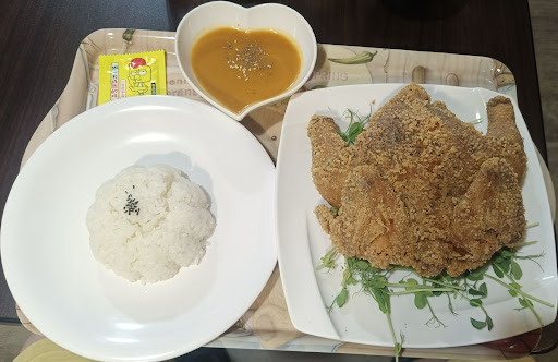Read more2025/04/27初訪,與友人聊天時意外談到的店家,便在前往建築展的路途中繞道前來品嘗。一樓空間很大,不過只有在前台點餐的功能而已。牆上有貼菜單和一些優惠或規則,可參考看看,旁邊的小桌子也有一堆菜單,慢慢看完後再到前台直接點餐即可。順帶一提,支付方式除了現金還包括街口支付以及台灣Pay還挺方便的。 點完餐後隨即便前往二樓入座,餐點貌似是從用餐區後方,廁所旁的菜梯送上來的,送上來後服務人員便會放置到旁邊的桌子,叫號取餐。不過由於我坐的位置近,餐點是直接被送上桌,非常貼心,除此之外入座前的招呼和提醒,還有介紹自助區的供應內容與小菜等,服務非常到位👍 小菜共四樣,分別為海帶芽、豆乾丁、醃蘿蔔絲,以及辣高麗菜乾泡菜,稱不上多特別不多談,而令人驚豔的還得是雞湯粥與麻辣鴨血。雞湯粥用雞架熬煮非常入味鮮甜,上層漂浮著的雞油,香而不膩,搭配上爽脆的木耳,以及被切成一條條軟軟的魚板,口感非常不錯,也大大滿足了味蕾😋美中不足的則是粥本身米的狀態其實更偏向稀飯,沒有到煲粥的等級🥸而麻辣鴨血更是王炸!味道醇厚、口感Q彈且扎實,麻辣的鮮味不停著刺激著味蕾,即便被辣得受不了也停不下嘴,相當有水準👍再搭配著自助區飄逸著椰香卻不死鹹或過於鮮甜的南洋咖哩,以及含有雞軟骨與切碎的雞爪的甜膩雞汁丼飯醬都非常合適,不經意間自助的白飯就盛了好幾碗呢😋 主菜的炸全雞也相當不錯,醃得非常入味,鹹味恰到好處的充斥於雞的身體各處,肉也非常多汁和酥脆的雞皮一同咬下,肉軟嫩好吃,被鮮甜肉汁浸濕的麵衣同時保有軟爛和酥脆的口感,在下層充滿彈性的雞皮更是進一步豐富了層次👍不過說到油炸食物,油膩感肯定無法避免,但鋪在炸雞下的豌豆芽卻很好的用生菜的樸素和微甘風味的清爽菜味很好的中和了,是個意想不到的絕佳組合呢🥸只可惜附上用來肢解炸雞的塑膠手套對我來說還是太薄了,雖然也能享受到美食,但略顯狼狽,所以下次再訪大概就會點比較簡單就能食用的其他餐點吧😂