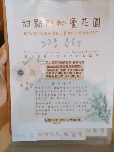 Read more因為正在自建自己的房子,星期天下雨天來三星看看不同風格的建築找尋靈感,意外在地圖上發現的甜點店。 不巧的是地圖顯示:甜點的秘蜜花園(大量訂單製作中,12/9重新開放內用) 心想都來了還是去看看吧! 車開到門口,燈亮著,還在狐疑有開店嗎?正想掉頭走人,老闆娘的爸爸便撐傘過來親切的說:因為今天恰巧老早有人訂位,所以目前可以接待我們喔! 真是太幸運了! 在老闆娘爸爸非常用心的跟我們介紹後,我們點了各自喜歡的甜點:冠軍巧克力布朗尼蛋糕、檸檬塔和兩杯飲料。 一吃起來,口感滑嫩、綿蜜且紮實,風味極佳,真是一件真材實料有水準的好作品喔!飲料也是料好實在又順口,深深感覺到老闆娘的用心,手藝超棒。 感謝老闆娘爸爸和老闆娘...