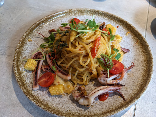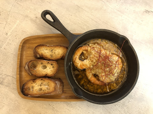 西班牙油蒜蝦 蝦子不小隻且鮮甜緊實 蒜頭下的量也很夠 整體吃起來蒜香十足 配上法式麵包很對味 *法式麵包可以再續一次 酥炸雞軟骨是一道很特別的料理 通常我們的認知是只有軟骨 但這家店是跟著雞肉炸 配上那白色微辣醬汁 真是一絕 炙燒骰子牛圓麵的骰子牛 肉的品質軟嫩 給的量也大方 麵香Q有鍋氣 是一道蠻推的料理 最後黑松露蜜鴨胸燉飯 鴨胸是屬於軟嫩不Q彈 當時以為它是用舒肥 肉裡吸滿了醬汁 非常入味 米粒雖然不是正統義大利做法但我還蠻愛的 裡頭也有些杏鮑菇片跟玉米筍來增添爽脆的口感 推推推! '