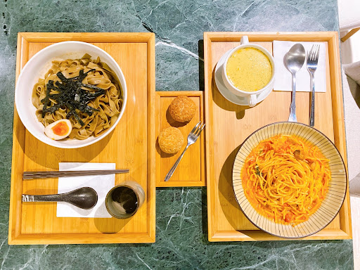 The restaurant sells western style meals, including pasta, and drinks, such as coffee, juice, and hard liquor.