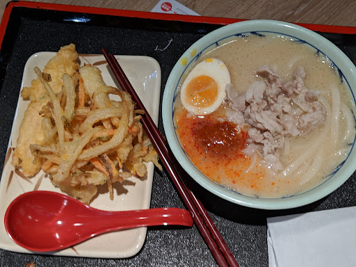 My favorite is the classic beef udon. The pictured one I got today is the spicy pork udon. Both are solid 4/5 stars. I typically get the kakiage tempura. It's deep fried onions and carrots and works really well. This branch had a tempura crab stick. The price was shockingly low for it, then I took a bite, it was imitation crab. That makes sense with the price then.