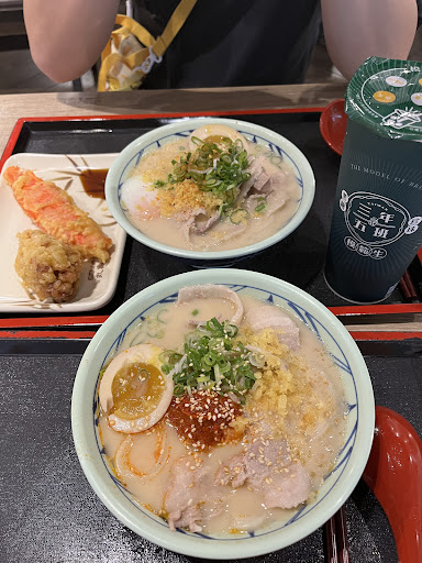 The BEST Marugame Udon place I have tried and I have been to San Francisco and Hawaii locations. I have never had the spicy pork udon and it seriously blew me away. Sweet beef makes me feel sick sometimes so this savory pork was right up my alley. The broth is so delicious and you know the udon is consistent and obviously bouncyyy! All of the staff are very nice and can speak English if you need more assistance while you get your food. It’s in a food court which I love because that means you can get bubble tea ☺️ We ate udon in Ximending and immediately regretted it when we found out Marugame Udon was nearly. We loved the food so much that we came back twice within our 8 day Taiwan trip 🫶非常好吃💯