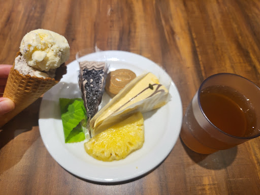 Steak is descent. Salad bar is ridiculously luxurious: Caesar salad, stewed pig's knuckles, duck's blood cake, chicken nuggets, French fries, hash browns, kantonchiho style soups, sweets, fresh fruits, ice cream, beverages - are regularly provided. Some dishes are randomly served, such as mussels, roasted ducks, fried fishes, bamboo salad, soy tender chicken, crabs, shrimps, sour-sweet fried pork, Thai style fried...