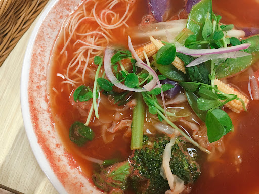 ❌Dish was clearly marked 全素 which means no allium. Arrives with raw purple onion on top. ❌Normally you get free extra noodles with your first order. The vegan one only comes with GF tofu noodles and you do not get an extra order, and it is not available as an extra order. ❌You cannot get a side of vegan noodles. ❌Repeat: you cannot get a side of vegan noodles. ❌Still hungry after eating the whole bowl and drinking most of the soup. ⭕️The tomato soup was tasty and light, like gazpacho! ❌The soup is much thinner and less flavorful than the regular tomato soup my friend had. ⭕️The shop staff offered to cook my extra order of eggplant in water instead of frying since they do not separate frying oils. 👍🏻