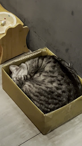 as for the interior, it’s pretty cramped, especially when you have to carefully navigate around their three cats. yes, there are cats walking around and lying on the counter that you can pet (though there are signs warning you not to hug them or pick them up), but why you’d want to sully your hands with cat right before using those same hands to eat is beyond me. i’m fine with the cats, but it’s just kind of annoying having to be super careful not to trod on them or their food bowls lying on the ground and on the already narrow stairway.
