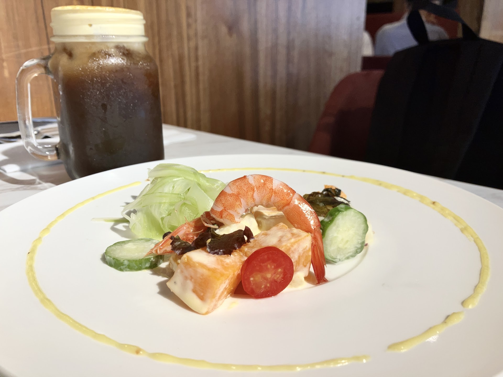 I had a Classic Set ($668) and I chose Roasted Steak for main course, Potato Salad With Shrimp, Chowder for soup, Chocolate Puffs for dessert and Black Tea with CrÚme Brûlée Powder. The Shrimp with Scallops Curry Yogurt Sauce (appetiser), Gratined Mushrooms + Bread Toasts and SAWA were fixed in the set. Furthermore, if you write a Google review like I did, you can get a Changpane or a scoop of vanilla ice cream.