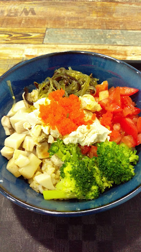 Unadorned restaurant highlighting vegetables, rice & seafood in poke bowls, plus salads.