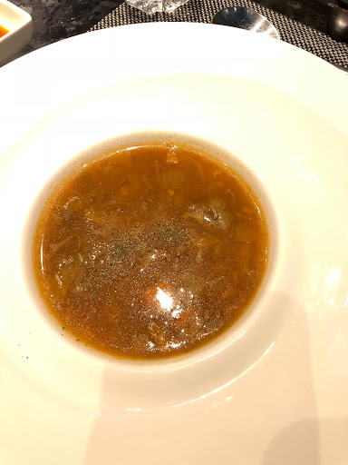 《上菜順序》 一進座服務生上即奉上冰開水 →無限續的2小格小菜:甘貝唇(吧?)+醬油漬碎洋葱(醬油略鹹),服務生看到吃完了會主動續 →蘿美生菜沙拉 →莎莎醬法式麵包 →羅宋牛肉湯 或 鮮魚清湯,2選1 →鰻魚蒸飯 →水果醋飲 →半龍蝦身+干貝+蘆筍+低溫烘過的蕃茄+蜂蜜芥茉醬 →今日主菜:桂花雞腿排 及...