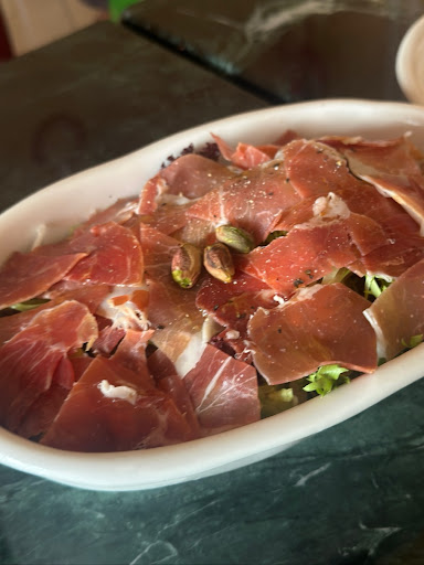 馬鈴薯濃湯:濃的像馬鈴薯泥的濃湯,個人很喜歡 生火腿沙拉:切得薄薄的生火腿鋪在生菜上,每一片上面都佈滿橄欖油,還有一些開心果點綴 番茄泥麵包:一開始沒預期到,是冷的! 烤布里起司⭐️⭐️⭐️非常愛這道!麵包烤的酥脆不焦、直接作立在一塊稍微加熱的Brie...