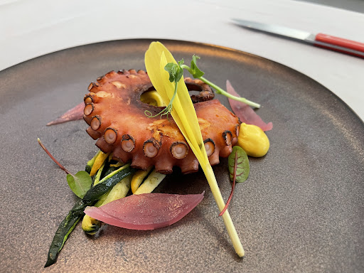 第四道是澎湖的某種章魚腳搭配蔬菜&甜椒醬&醃漬紅洋蔥 服務生有特別說 章魚腳比較鹹,搭配蔬菜吃比較剛好,我覺得很合乎邏輯,蔬菜&洋蔥&甜椒醬都很好吃,而且蔬菜切成條狀有脆口感,再加上章魚腳Q彈稍許咀嚼,我覺得口感是不錯的。但章魚腳真的太鹹太鹹了,導致吃到的時候一直有死鹹死鹹的感覺,腦中會有咦怎麼這麼鹹,章魚特有的鮮味真的跳不出來,其他搭配的東西有去努力解鹹,但真的不夠太多,甜椒醬就很棒,可能再多一小球會更好,整體來說今天吃完最不喜歡的一道
