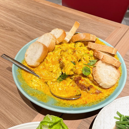 椰香綠咖喱雞: 雞肉超嫩!我原本還要以為這種咖喱燉雞常常會煮到肉柴柴,但饗泰多熟度抓得非常好,又嫩又juicy...