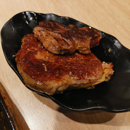 我對大眾式牛排向來沒有什麼期待,就是吃個粗飽,沾沾牛味。我那天真的老婆不聽店員7分熟的建議,堅持要5分熟,果然,我的厚切沙朗上來真的太生軟了,因為台式牛排店薄利多銷,肉品級數不高,多選較柴的部位,所以會先肉質軟化處理,煎熟一些反而好吃,幸好店員非常周到,立刻送回廚房重煎,哇!表層 "恰恰的"...