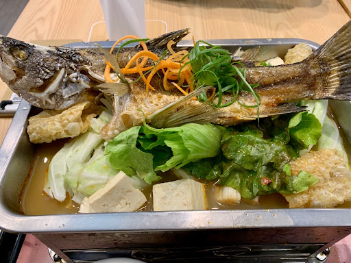 Read more2023/5/19二訪 隔3個月用餐,餐點漲價$10~$20。 ◆麻辣水煮牛(乾火鍋)$330:湯底一樣偏清淡,肉片的量給的很有誠意,要留意請店員加湯,否則食材不易熟。 ◆壽喜牛(乾火鍋)$310:肉片量給很足,有蔬菜、豆腐及一些火鍋料。 ◆清蒸鱸魚套餐$360:是整隻鱸魚,需等待比較久,鱸魚吃來新鮮嫩口。 ◆牛奶鍋(牛五花)$310:菜量及肉量很多,食量大的人吃也很有飽足感,加湯是加牛奶原湯,因此煮到後面湯頭不會變淡。 ◆炸魚薯條$150:魚塊香酥,但麵衣偏厚會刮嘴,魚肉嫩,醬料建議可以搭配檸檬或塔塔醬。 整體而言,服務一樣待加強,像是主動詢問加湯等,餐點還沒吃完店員也急著收走。附餐飲料很大杯,但口味比例喝起來真的很廉價,完全不甜或太甜。是一間定位在「吃粗飽」的簡餐店。 ————————————————————————————————————— 竹山在地經營多年的簡餐店,餐點品項選擇多,價錢合理,適合多人聚餐。 ◆麻辣烤魚(乾火鍋)$370:視覺效果大於味道,提供一整隻鱸魚,說是烤魚吃起來比較像是煎的,魚肉質偏柴。乾火鍋其實也就是少一點湯的火鍋,麻辣湯底偏清淡且並沒有煮進去魚肉讓魚入味。 ◆麻辣水煮牛(乾火鍋)$330:湯底偏清淡,肉片的量給的很有誠意。 ◆唐揚炸雞$100:裹粉厚,吃不太出雞肉的鮮嫩,不推! ◆炸豆腐方塊$70:過關的炸豆腐,搭配附上的蒜蓉醬油,鹹香可口。 整體而言,餐點口味表現差強人意,但份量上是滿足的,食量大的白飯也可以免費續一碗。當天服務是扣分的,當天候位時已和兩位不同店員說明兩次需要兩張兒童座椅,入座時沒有一個店員有記得,兩張椅子換成兒童座椅時也沒有把椅子撤走,就放在一旁堵住出入。索要餐具也要二次提醒,至少有3位店員站...