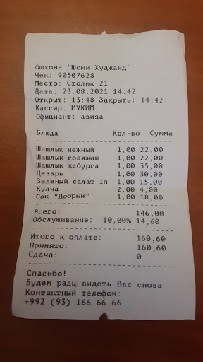 Всем добрый день мы сегодня навестили Шоми Худжанд честно скажу шашлык детям не понравилось не доели а мне по началу показалось вкусным а потом привкус какойто какбутто мясо испорченная было его оброботоли ссодой чтоли привкус соди а на кассе девушка очень нериятно с нами обращалась карта Душанбе сити не проходит мы всегда картой пользуемся без мобилного приложения а у них оказевается не проходит около 30 минут нам пришлось стоять и ждать что делать дальше позвонили знакомым чтобы им на карту по номеру тел перевили а потом мы от туда ушли все не доволними я вообще в этот завидение...
