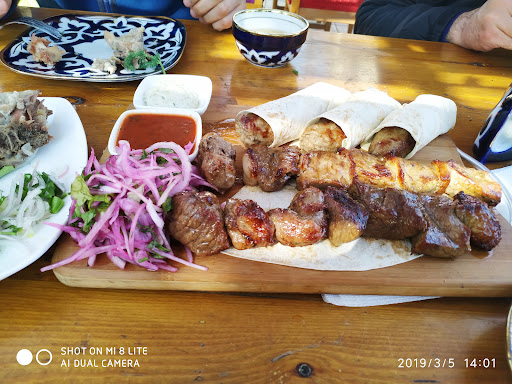 Read moreОфициант не предупредил с самого начала что будет живая музыка на улице. Уговорил нас туда пойти якобы потому что внутри душно. С каждого человека 15 сомон (2$) за то что женщина под фонограмму попела на таджикском, ну не очень хотелось отдавать. Бара нет, пива нет, вина нет.. Официант предложил съездить за виски в другую кафешку... Шашлык из курицы был ужасный, все остальные блюда на 3, плов на 5, но думаю это того не стоит. В Таджикистане на каждом углу готовят прекрасный плов.