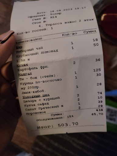 Read moreВ первый раз пришли в заведение по рекомендации, бронировали столик, спросил заранее есть ли оплата по карте(в итоге терминала не было) на рецепшене не кто не встретил, внимание ни какого не уделили, только где то после 5 минут нас догнали когда сами решили сесть за стол. Столы не были засерверованы вообще, приходилось каждого сотрудника останавливать что бы принесли салфетки и приборы и т. Д. Когда принесли приборы они были не натерты и на посуде были сколы. Официанта ждали очень долго, не было никакого внимание на гостей все как в столовой(в столовой может и лучше) , одним словом до ресторана им как до Китая. Да место красивое, но отвратное гостеприимство и еда не особо вкусная что бы вау но дорого, шашлык хотели не было, да и половины меню нет в наличии. Мясо жёсткое. За столом как и говорил не кто не следил просили что бы хотя бы тарелки чистые принесли. И конечно вишенка на всем этом ужасном сервисе, принесли счёт где уже было включено 15% за обслуживание про который ни чего и где не написано(впервые с таким сталкиваюсь, даже в меню не указано что есть плата за обслуживание ) , да можно бы ло бы оставить чаевые если бы был хороший сервис по итогу пришлось спрашивать несколько официантов про этот чек все сразу странно себя ведут, ждали пока позовут администратора или старшего кто мог бы рассказать правило заведения, прождали очень долго может минут 30 или больше, но в итоге не кто из старших не пришёл, сказали что его нет на месте(может не сказали им) это будет тайна, По итогу решили не ждать пока выпадет снег, Спасибо за испорченный вечер, надеюсь руководство увидит свою проблему, если считаетесь рестораном делайте...