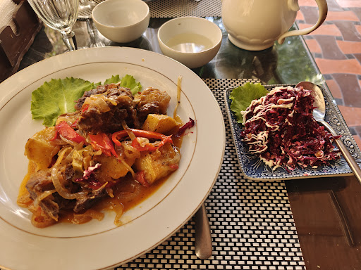 Read moreFirstly, the food is truly delicious! I had the Kazan kebab and a beetroot salad. The kebab was so tender, and everything was so flavorful, I finished the whole plate although it was a big portion. The salad was delicious, very fresh and lots of walnuts and the best part, only a little drizzle of mayonnaise. Most places put too much mayonnaise, but this one was perfect and still flavorful. The portions here are big, I was too full. I also took away the baked cheesecake, it was divine, very creamy and not too sweet. I'm so glad I came to fix my car at the mechanic close by, it's the best meal I've had in Tajikistan! Also very friendly and fast service. The environment is nice too, very beautifully set up with little water features. Highly recommend...