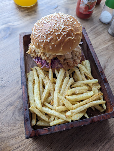 This place is now located on the top floor of the post office. Getting in can be a bit tricky but just ask locals around the post office how to get in. The fried chicken burger was okay. It could have been great if they would take the time to drain the cabbage longer before spooning it onto the sandwich. As it was there was way too much purple juice soaking the burger bun and making quite a mess on my fingers. The extra juice really didn't help the flavor so why not strain that a bit? My wife ordered the OG box with shrimp. She loved it and the taste I had from it was very fresh and quite yummy. The brownies were refrigerated and were rich and tasty but I would recommend asking them to heat it for you first. There is a great view from their balcony onto the street below for...