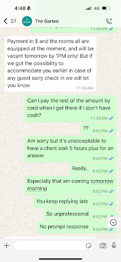 Read moreLet me warn you guys, please don't be fooled by the pictures and I advice you to run away before you book in The Garten Hotel. I have to admit that the interior is really nice and the outdoor area is beautiful. HOWEVER, all of this goes to waste because there's nothing else that is good about it. I booked for my 3 nights stay in paje and it was a nightmare. First of all, the person in charge of answering whatsapp was very disrespectful and unprofessional. Coming from a whole different continent, someone would really want to know all about the new place he/ she gna stay at. They were responding one day later and sometimes ignore my messages until I double text again. When I was asking my last question before i fly to Zanzibar which is about the payment, the person on whatsapp told me that "it's not part of his job to answer me". I WILL PUT ALL THE SCREENSHOTS HERE SO PLEASE CHECK THEM TO SEE HOW THEY TREAT GUESTS. Morever, breakfast was very limited and the plates smelled like fish. To make it worse, i came back from a whole day of tourism wanting to shower and relax in my room. To my surprise, my room's water heater was not working. I spent 2 hours waiting for maintenance to fix it and still nothing. I asked for the staff to heat some water for me, they got me a dirty water bucket that is not even enough to wash hands. They promised to fix it in the morning, and after they said they did, i tried to shower again and nothing but dripping water that turned cold after 2 minutes. On top of all that, one of the staff members called me "dramatic" for being upset about all this. I had to check out and leave to another hotel. They didn't even try to make it up for me in anyway and took the price of this horrible night. Congrats on winning the worst hospitality...